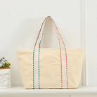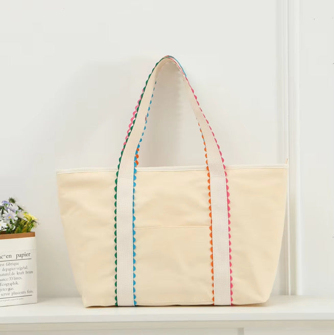 Canvas tote with ric rac trim. Fully lined. Interior pocket has a zipper and is opposite the front exterior pocket. Zipper Closure