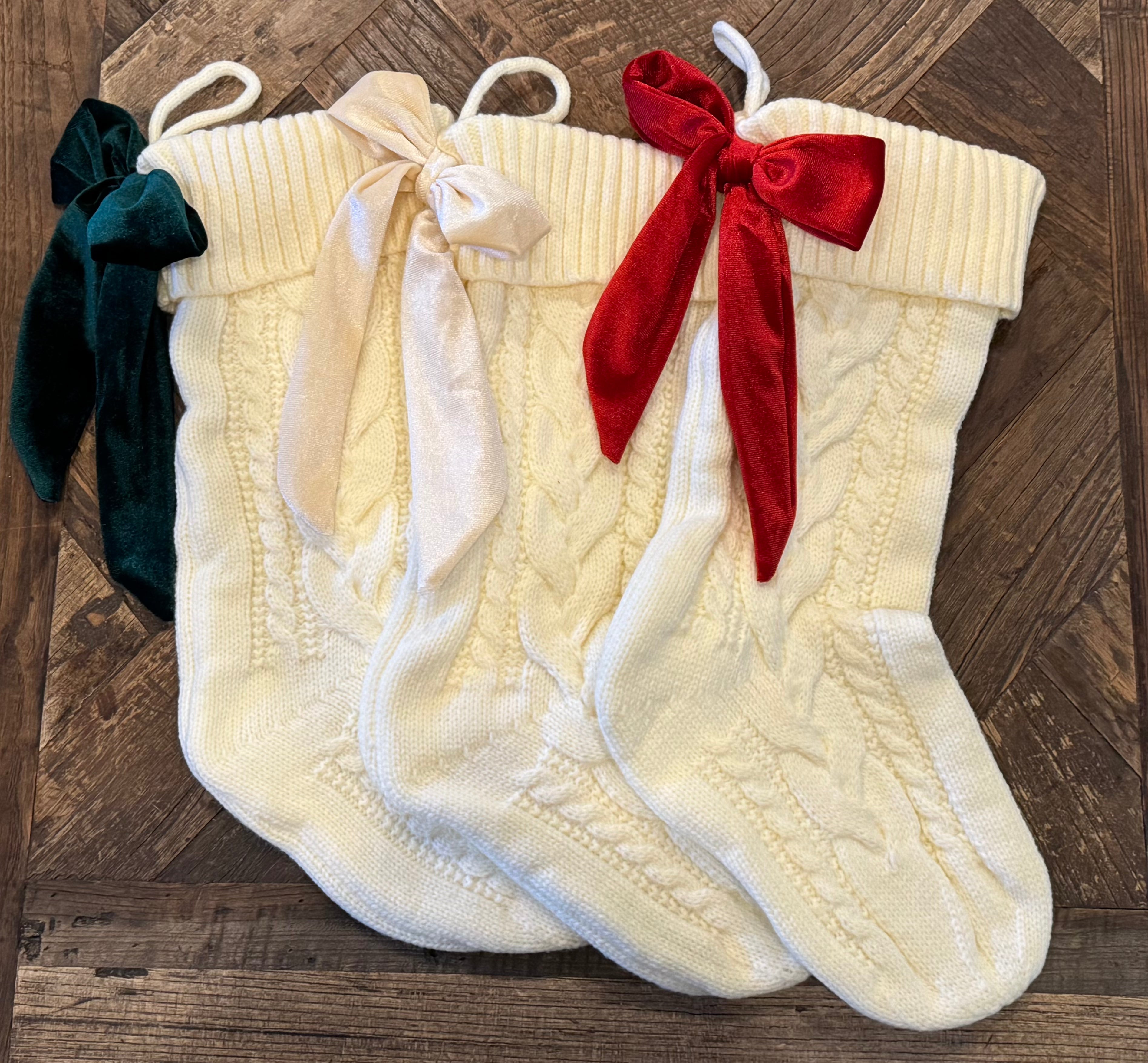 Cream cable knit stocking with green, red, or cream velvet ribbon.