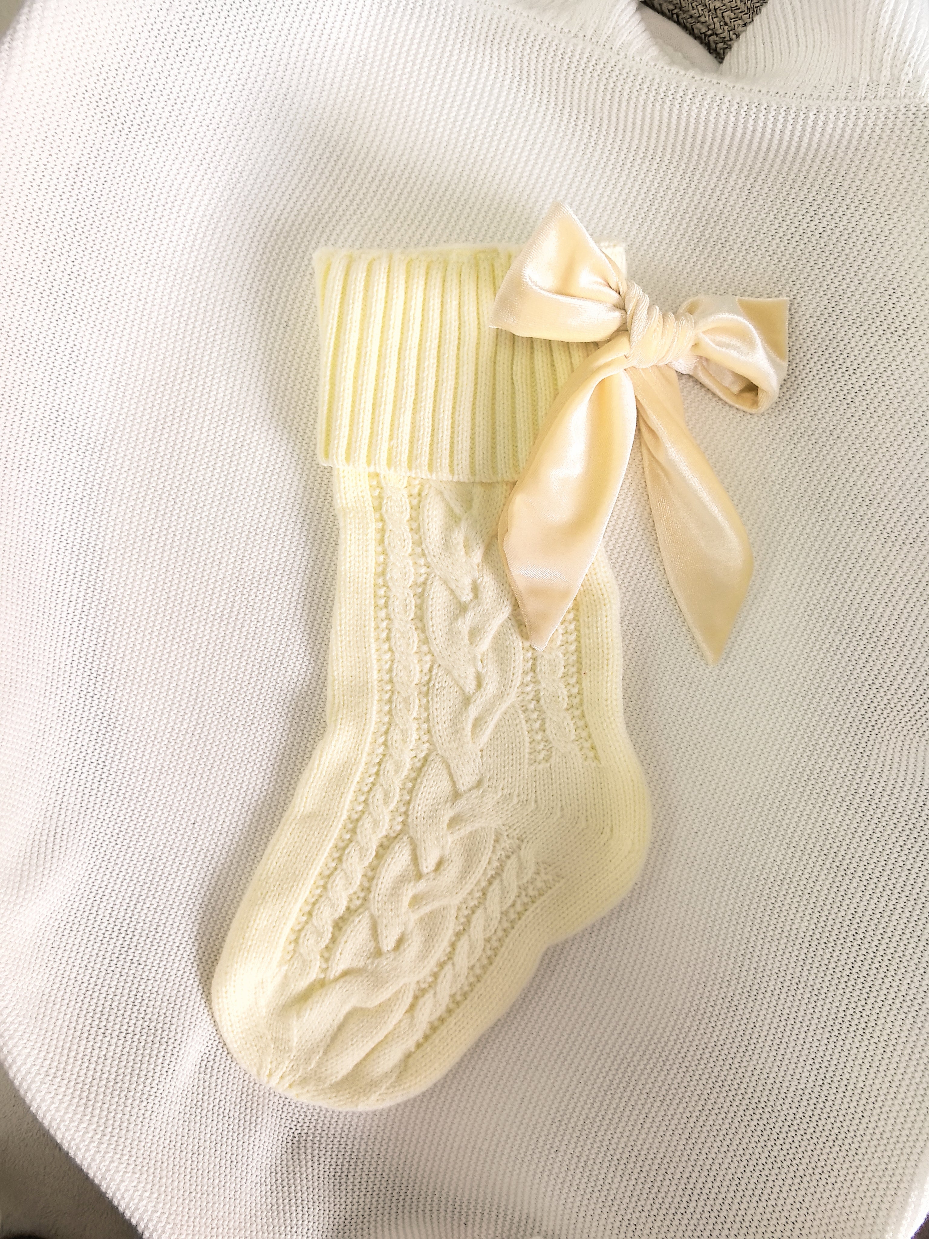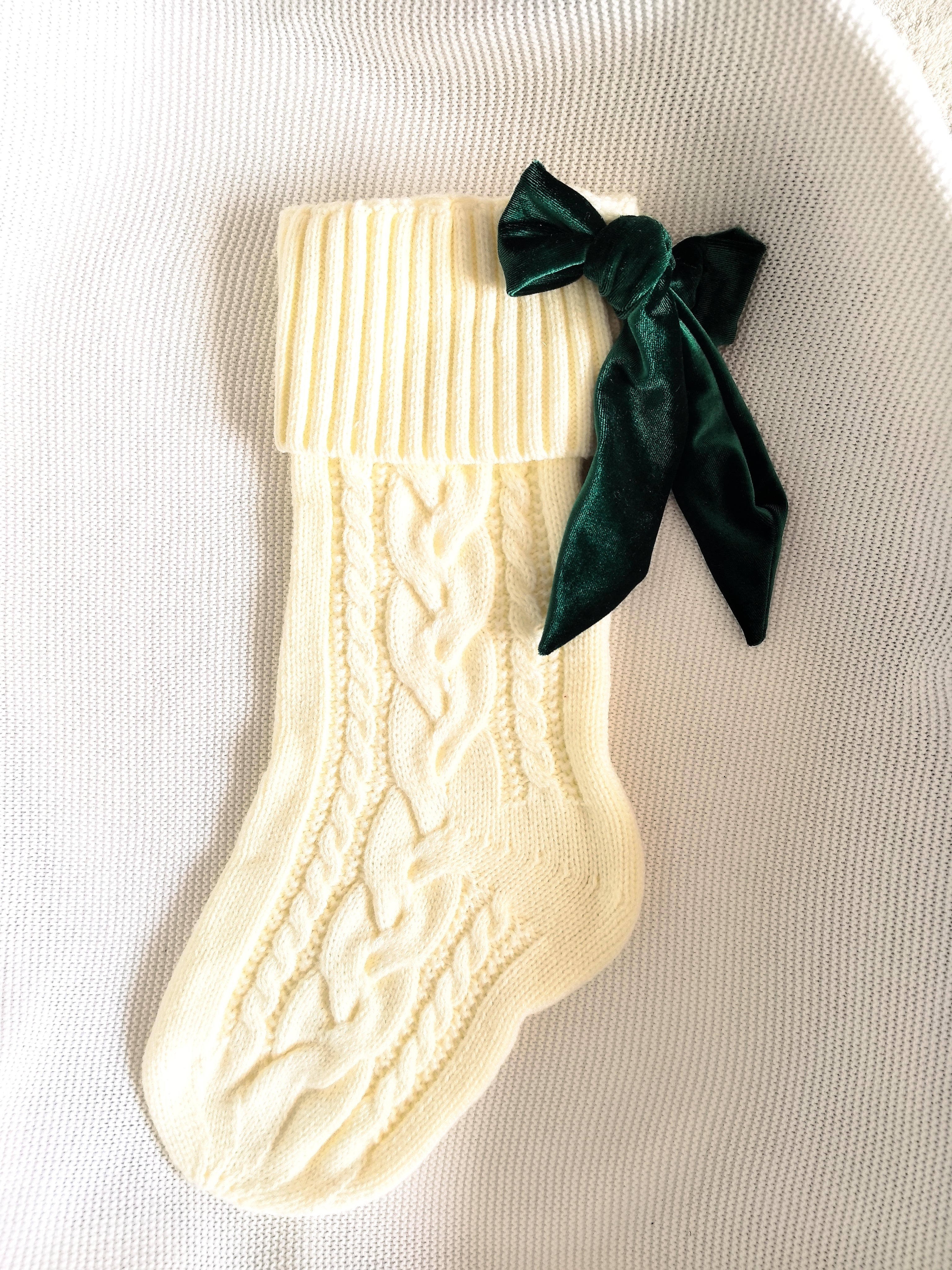 Cream cable knit stocking with green, red, black, or cream velvet type ribbon.