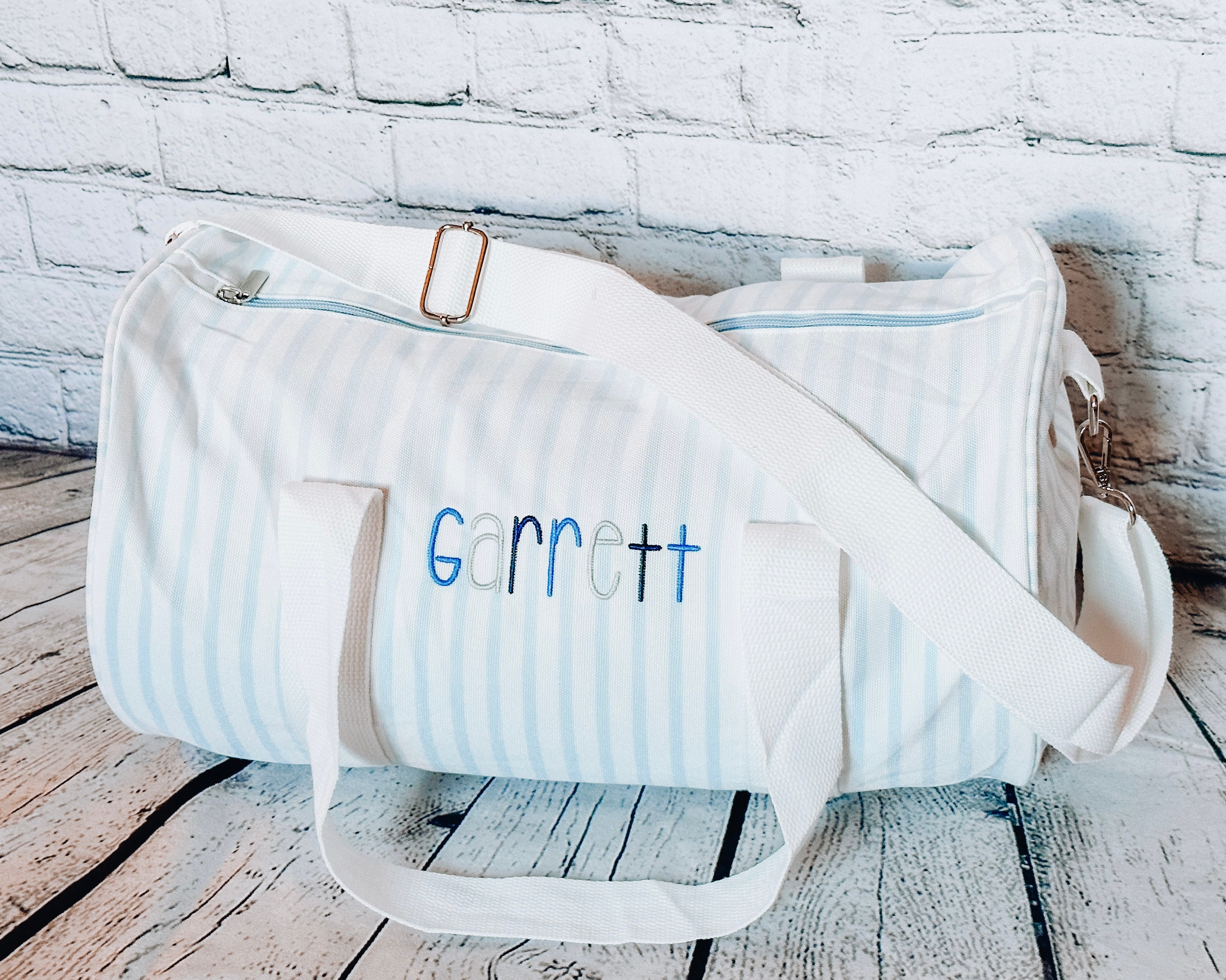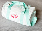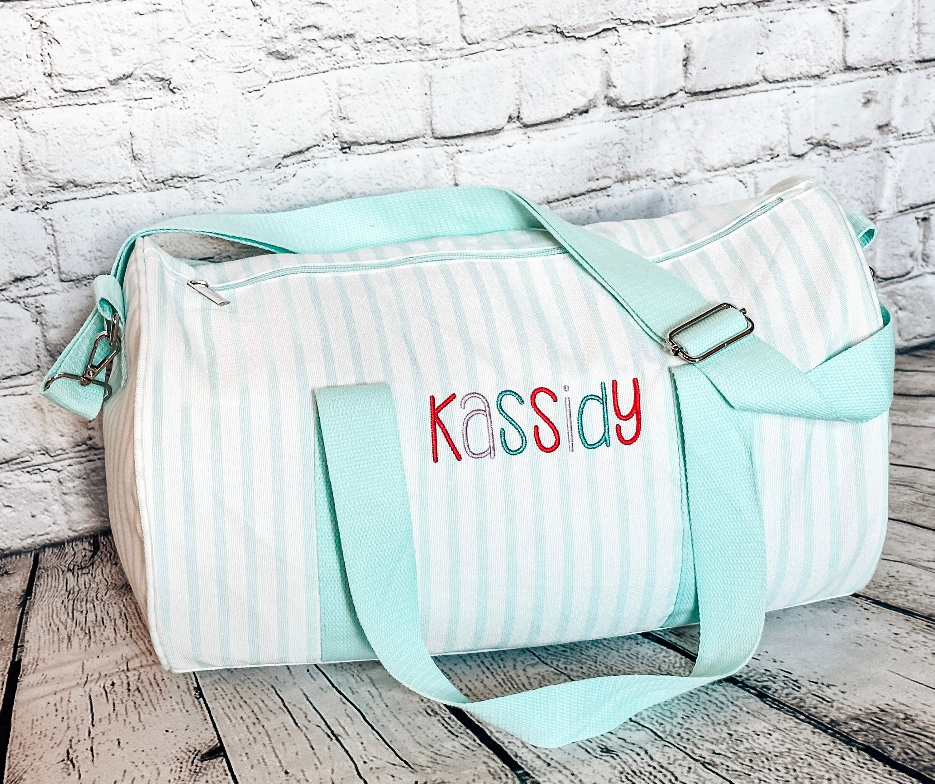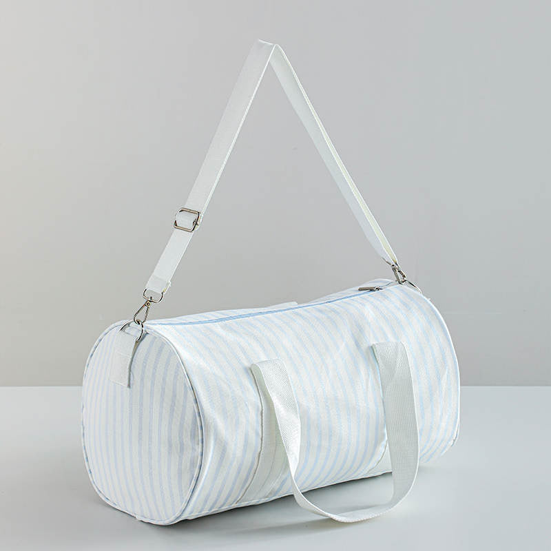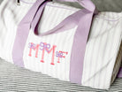 The perfect size duffle bag for a growing child. 15.7" x 9.5". Comes with detachable shoulder strap. Small interior pocket with zipper closer. Cotton canvas striped exterior with fully lined nylon interior.
