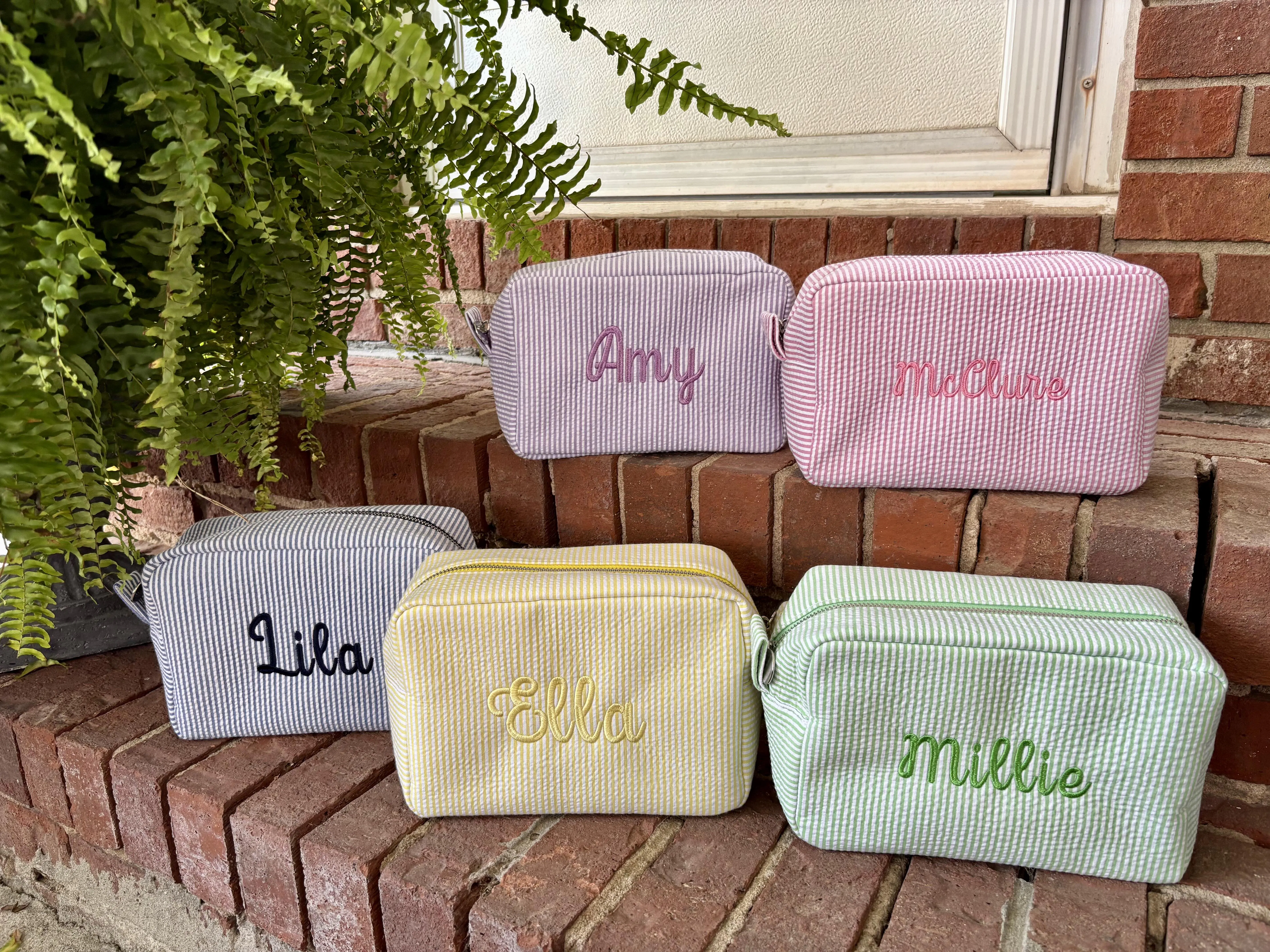 Charming, practical, and ready for personalization, our Seersucker Everything Bags are a must-have staple for embroidery boutiques. Designed to be the perfect travel toiletry bag, these versatile pouches are just as handy for holding cosmetics, hair bows, or everyday essentials as they are for stashing small toys and treasured finds for little ones.